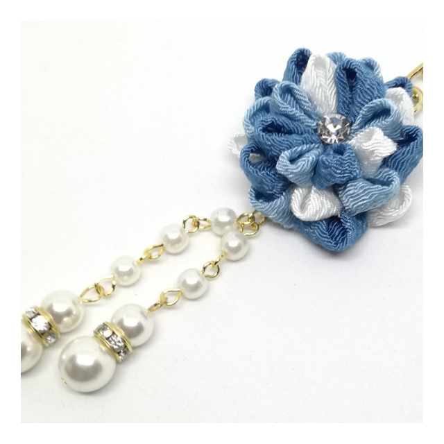 つまみ細工のお花の中心にキラキラ光るラインストーン、さらにパールチェーンの間にラインストーンが入った揺れる下がり付きです。