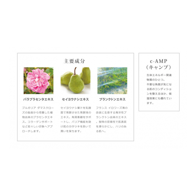 年齢を重ねるにつれて乱れる肌のコンディションを自然の成分で整えて、キメ細やかな潤い溢れる肌へ、さらに、「バラプラセンタエキス」が肌の若々しい印象へアプローチして、しっとりとしたハリ感を与えます。
