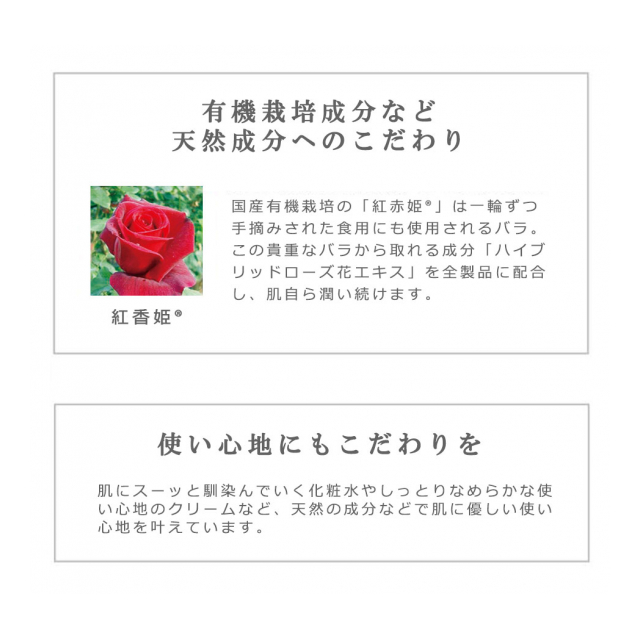 年齢とともに肌に現れる黄グスミ、シワやタルミの原因である『糖化』に着眼。全製品に配合した抗糖化成分は、島根県産有機栽培で手摘みされた食用にも使用されるバラ「紅香姫(あかひめ)」から抽出したこだわりの自然派原料。使い続けることで、輝くような明るさを実感していただけます。
