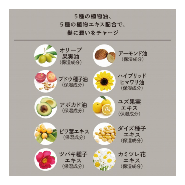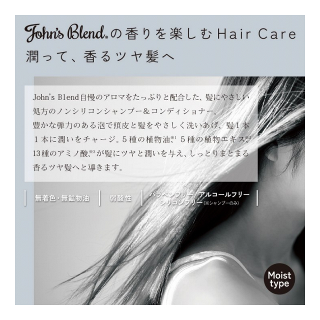 John's Blend自慢のアロマをたっぷりと配合した、髪にやさしい処方のシャンプー。豊かな弾力のある泡で頭皮と髪をやさしく洗い上げ、髪1本1本にうるおいをチャージ。5種の植物油、5種の植物エキス、13種のアミノ酸が髪にツヤと潤いを与え、しっとりまとまる香るツヤ髪へと導きます。