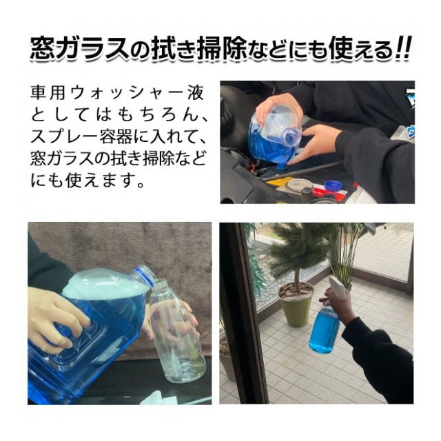 車用ウォッシャー液としてはもちろん、スプレー容器に入れて、窓ガラスの拭き掃除などにも使えます。ka