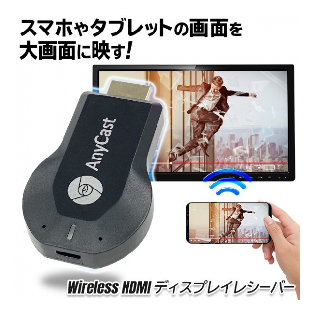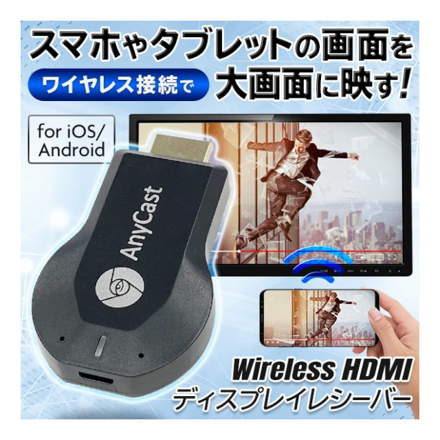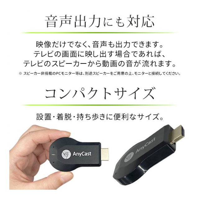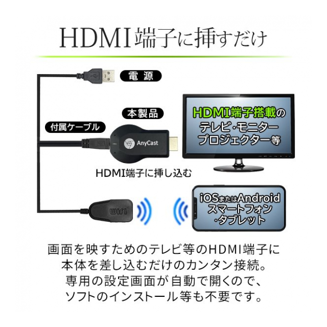 | 付属品 電源供給用USBケーブル、取扱説明書 ■ 注意事項 ■ ※ アプリや動画・番組配信サービスによっては、著作権保護などの理由から、映像を映し出せない場合があります。また、現在対応していても、アップデート等によりミラーリングができなくなる可能性があります。 ※ Miracast非対応のAndroidスマホではご使用いただけません。 ※ 当店では、対応しているアプリ・サービスについてはお答えできかねます。 ※ 本製品はHDMI端子を搭載していないモニター等には使用できません。 ※ 本製品は、インターネット環境下のないときは使用できません。 ※ 本製品は付属の電源供給ケーブルを使用して給電する必要があります。 ※ スピーカー非搭載のPCモニター等にミラーリングする場合は、別途スピーカーをご用意の上、スピーカーをモニターに接続してから音声を出力してください。 ・ 掲載画像はイメージであり、実際の製品とは多少異なる場合があります。 ・ 製品の仕様は品質の向上・改善のため、予告なく変更となる場合があります。 |