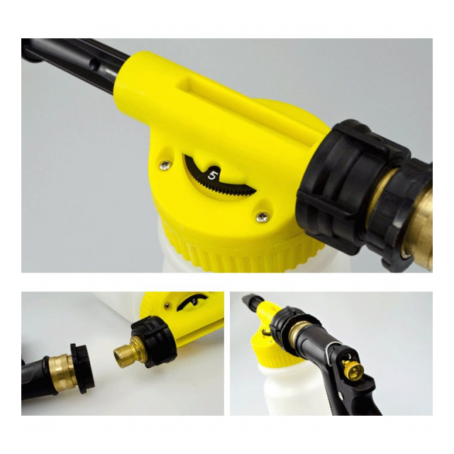 カーシャンプーを入れ、ご家庭のホースに直接取り付けるだけで、