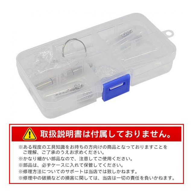 | ・シリコン鼻パッド(大)×10 ・シリコン鼻パッド(小)×10 ・プラワッシャー(2種類)×各20 ・プラキャップ×20 ・ネジ(3種類)×各20 ・ナット(2種類)×各20 ・イヤーパッド×2 ・ドライバー(プラス、マイナス、ナット用)×1 ネジのサイズ : 大 長さ(約)4.7mmx幅(約)1.33mm 中 長さ(約)4.3mmx幅(約)1.17mm 小 長さ(約)4.1mmx幅(約)0.98mm ※ 幅はネジ軸の部分の幅です。ヘッド部の幅ではありません。 ※ かなり細かい部品なので、注意してご使用ください。 ※ 部品は、必ずケースに入れて保管してください。 ※ 輸入品となり、修理方法についてのサポートは当店では致しかねます。 ※ 取扱説明書は付属しておりません。ご了承ください。 ※ 修理中の破損などの損害に関しては、当店は一切の責任を負いかねます。 ● 掲載画像はイメージであり、実際の製品とは多少異なる場合があります。 ● 製品の仕様は品質の向上・改善のため、予告なく変更となる場合があります。 |