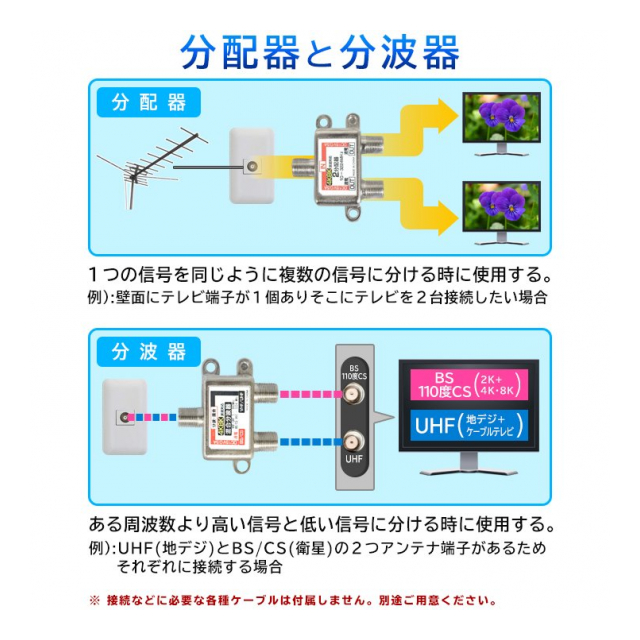分配器は、同軸線(アンテナケーブル)を複数の線に分けるためのアンテナ部品です。