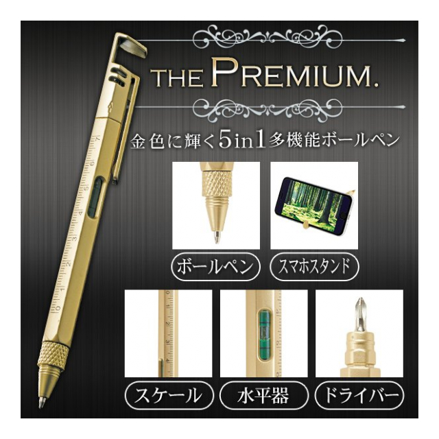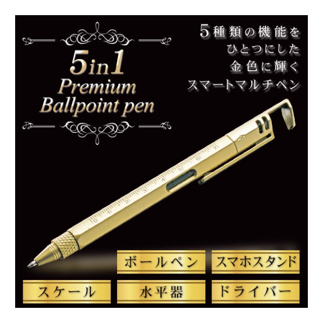 5in1マルチボールペン プレミアムボールペン 5役 ボールペン ドライバー 水平器 スケール スマホスタンド 便利ツール 文具 工具 筆記用具 便利グッズ 景品 ノベルティ ◇ ツールペン金