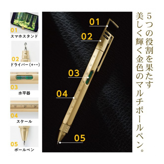 5つの役割を果たす、美しく輝く金色のマルチボールペン。