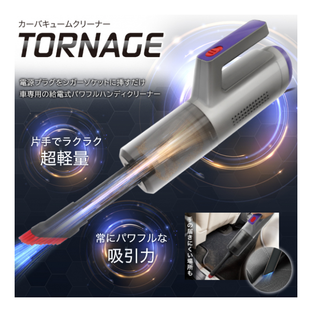 掃除機 車用 カーバキューム掃除機 トルネージ 2WAYノズル付 ブラシノズル すき間ノズル シガー電源 カークリーナー 給電式 車内 ハンディクリーナー パワフル カー用品 洗車 掃除用品 ◇ トルネージA
