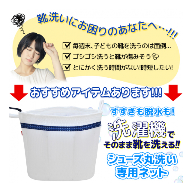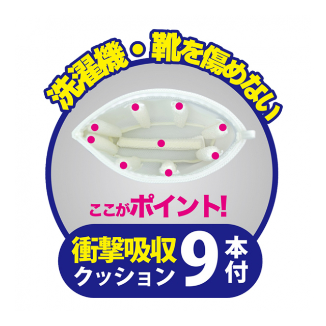 | 製造国 日本 備考 実用新案登録済 使用できる履物 上履き、スリッパ、運動靴 など ※本製品は構造上浮力があるので、洗濯機の中で浮きやすくなっています。 洗濯開始時に水面に浮いた状態にならないよう、ほかの洗濯物よりも本製品を先に入れてご使用ください。 ※洗濯したい靴の汚れがひどい場合は、あらかじめブラシなどで汚れのひどい部分を軽く洗うか、つけ置き洗いなどを行ってください。 ※靴についた土や泥、石などは必ず落としてからご使用ください。 ※乾燥機・乾燥機能は使用しないでください。 ※高額な靴や革靴、生地の柔らかい靴、装飾のある靴は使用しないでください。 ※靴のデザインによってはネットに入らない場合もあります。 ※靴によっては十分に脱水できない場合もあります。 ※煮沸や熱湯消毒はしないでください。 ※漂白剤は使用しないでください。 ・ 掲載画像はイメージであり、実際の製品とは多少異なる場合があります。 ・ パッケージや個装形態は入荷時期によって変更となる場合があります。 ・ 製品の仕様は品質の向上・改善のため、予告なく変更となる場合があります。 |