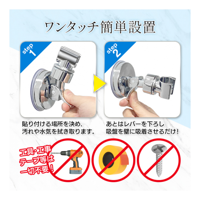 | 《吸着できない・吸着しにくい場所》 ● 模様のあるタイルやステンレス ● ビニールや布などの壁面 ● 表面がザラザラのガラス、凹凸のある面、木壁、漆喰、モルタル ● キズなどのある場所やキズがついたガラス面・表面加工されて密着できない場所 ※取り付け場所によっては、色移りや吸着跡が残る場合がありますのでご注意ください。 ※シャワーホースやシャワーヘッドのサイズによっては本製品を使用できない場合もあります。 ※シャワーホースやシャワーヘッドは一切付属しません。 ・ 掲載画像はイメージであり、実際の製品とは多少異なる場合があります。 ・ パッケージや個装形態は入荷時期によって変更となる場合があります。 ・ 製品の仕様は品質の向上・改善のため、予告なく変更となる場合があります。 |