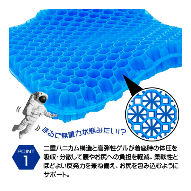 空気の循環に優れた2層構造のジェルがお尻への負担を軽減。