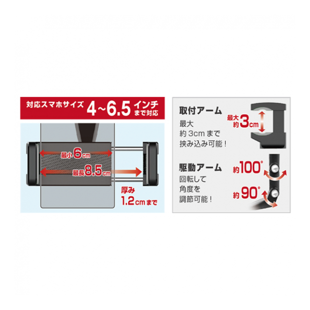 | 耐荷重 約400g 対応サイズ 4ー6.5インチまでのスマートフォン(幅もしくは高さ6ー8.5cm、厚み1.2cmまでの機器) セット内容 本体×1個 留め具×1個 ホルダー×1個 取扱説明書 ※対応サイズ内であっても機種などによりホルダーに取り付けられない場合があります。 ※自動車運転中に取付けた機器を操作しないでください。必ず安全な場所に駐車してから操作してください。 ※本製品の使用に際し、走行中の事故等が発生した場合について、弊社では一切の責任を負いません。 ※本製品の使用に際し、取付けた機器が破損・データ破損した場合について、弊社では一切の責任を負いません。 ・ 掲載画像はイメージであり、実際の製品とは多少異なる場合があります。 ・ 製品の仕様は品質の向上・改善のため、予告なく変更となる場合があります。 ・ 入荷時期によってパッケージは多少異なる場合があります。 |