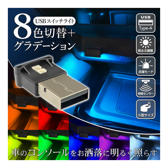 車 USBライト Type-A イルミネーションライト 手元灯 足元灯 おしゃれ カスタム LED ミニライト for USB 明暗センサー搭載 自動点灯 自動OFF パソコン カー用品 車載 車内 照明 USB イルミライト タイプA ルームライト 補助照明 USBポートカバー 8色ライト グラデーショモード 切替 PCアクセサリー ◇ USBスイッチライト