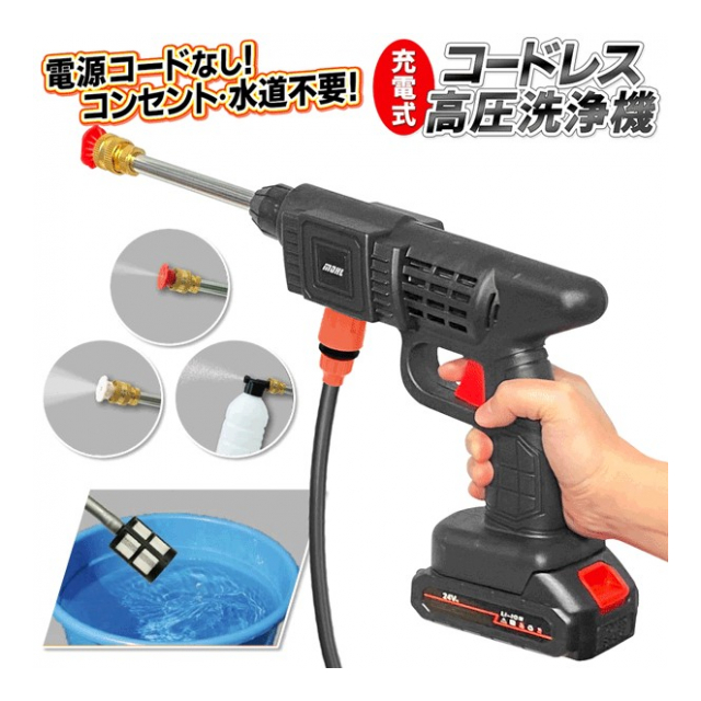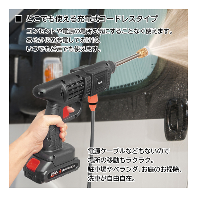 コンセントや水道がなくても洗車・掃除ができる高圧洗浄器です。