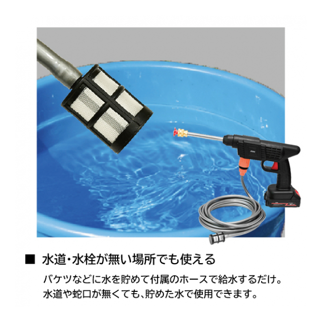 バケツなどに水を貯めて付属のホースで給水するだけ!