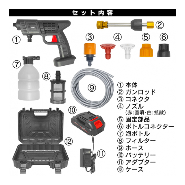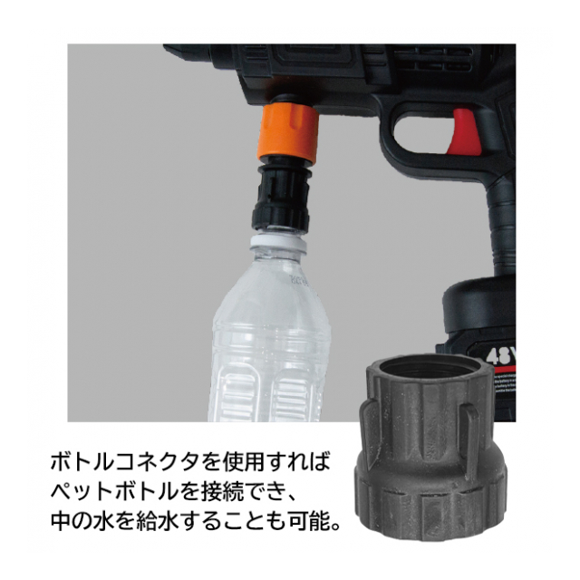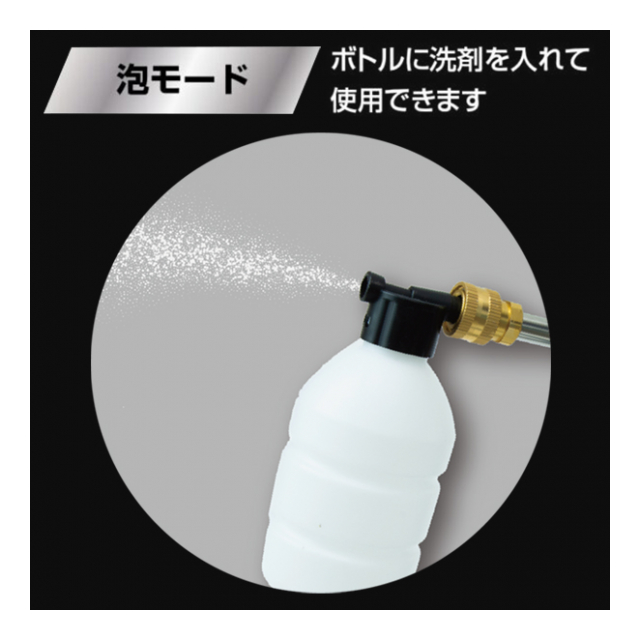 ・・・付属の泡用ボトルに、カーシャンプー(別売)を入れます。あとはノズルにセットすれば泡を噴射することができます。洗車にぴったり!