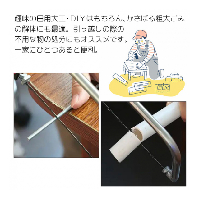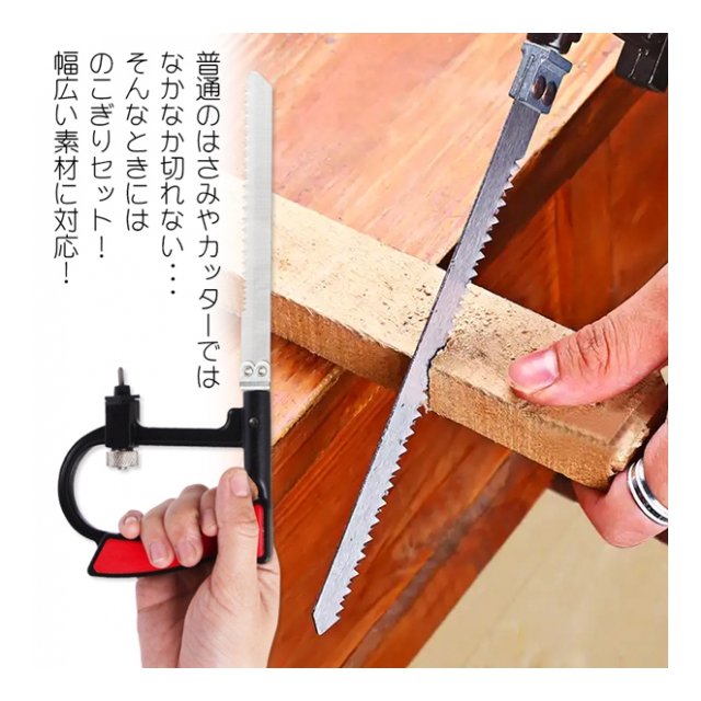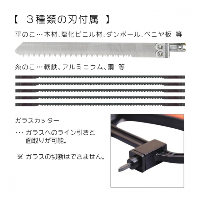 | セット内容 本体 糸のこ刃×5 平のこ刃×1 ガラスカッター×1 固定ネジ×1 対応素材 ■ガラスカッター・・・ガラスへのライン引き ※ガラスの切断はできません。 ■糸のこ刃・・・鉄、アルミニウム、銅 ■平のこ刃・・・植木剪定、木材、塩化ビニル、ダンボール、ベニヤ板 ・ 掲載画像はイメージであり、実際の製品とは多少異なる場合があります。 ・ パッケージや個装形態は入荷時期によって変更となる場合があります。 ・ 製品の仕様は品質の向上・改善のため、予告なく変更となる場合があります。 |