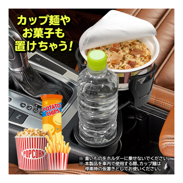 | 上部ホルダー対応総重量 600gまで(目安) 取付可能なドリンクホルダー ●内径φ70ー79mm ●深さ65ー80mm 取付不可のドリンクホルダー ●可動仕切りタイプ ●引き出しタイプ ●ドア部の純正ドリンクホルダー ●エアコン吹き出し口取付の後付けのドリンクホルダー 以下には取り付けないでください ●運転操作や視界の妨げになる場所 ●安全の妨げや危険の生じる場所 ※本製品を車内で使用する際、しっかりと取り付けられていることを必ず確認してから発進してください。 ※本製品を車内で使用する際、カップ麺は停車時の仮置きとしてお使いください。 ※場所によっては設置できない場合もあります。すべての場所に設置できることを保障するものではありません。 ※重いものをホルダーに乗せないでください。 ・ 掲載画像はイメージであり、実際の製品とは多少異なる場合があります。 ・ パッケージや個装形態は入荷時期によって変更となる場合があります。 ・ 製品の仕様は品質の向上・改善のため、予告なく変更となる場合があります。 |