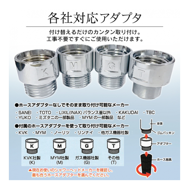 | 最高使用温度 約60度 セット内容 本体 ホースアダプター(K・M・G・T) 取扱説明書 ▼取り付けについて▼ ・ホースアダプターなしでそのまま取り付け可能なメーカー SANEI・TOTO・LIXIL(INAX)バランス釜以外・KAKUDAI・TBC・YUKO・ミズタニの一部製品・MYMの一部製品 など ・付属のホースアダプタを使って取り付け可能なメーカー KVK・MYM社製・ガス機器社製・その他 ※LIXIL(INAX)・ノーリツ・リンナイ社製・のシャワーヘッドで一部取り外せない機種がございます。必ずご購入前に外せることをご確認ください。 ▼取り付け不可▼ ・逆流防止機構(逆流弁)が付いていない混合栓 ・バランス釜(浴槽に隣接して設置されている風呂釜) ・エコキュートおよび電気温水器等の深夜電力による給湯器 ※上記以外にも非対応の浴室設備の場合があります。 ※使用環境により効果は異なります。 ※水道代・ガス代の節約を約束するものではありません。 ・ 掲載画像はイメージであり、実際の製品とは多少異なる場合があります。 ・ パッケージや個装形態は入荷時期によって変更となる場合があります。 ・ 製品の仕様は品質の向上・改善のため、予告なく変更となる場合があります。 |