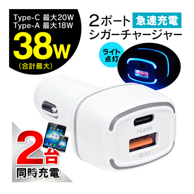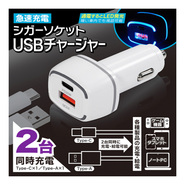 急速充電 シガーソケット USBチャージャー QC3.0 2台同時充電可能 USB Type-C Type-A クイックチャージ ソケット 取り付け 充電器 シガー ブルーLED スマホ iPhone アンドロイド スマホ カー用品 急速充電 Quick Charge 3.0 対応 シガーソケット 充電器 カーチャージャー スマホ ゲーム機 車載充電器 ◇ シガーチャージャーIB