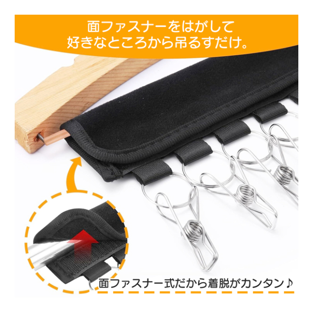 ポールやハンガー、洗濯ひもなどに吊るせる!