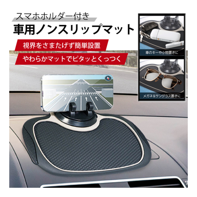 スマホスタンド付 滑り止めマット 車用 ノンスリップマット スマホスタンド 360°回転 スマホホルダー サングラス メガネ置き 駐車券置き 車載スタンド 収納用品 便利グッズ スマホも置ける 滑り止めマット 車載ホルダー iPhone アンドロイド スマートフォン スタンド キッチン デスクにも置ける 車載スタンド ◇ スマホホルダー付滑止マット