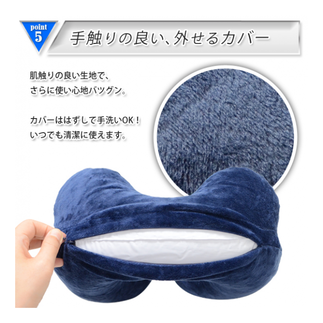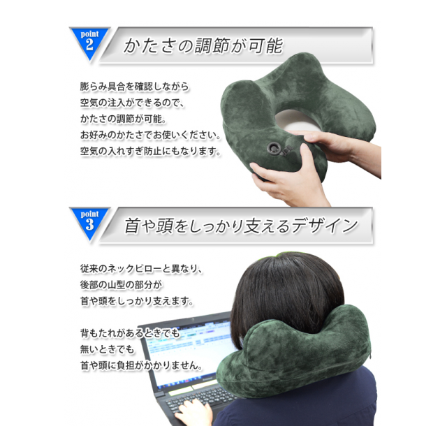また、従来のネックピローと異なり、山型の部分が後部から首や頭をしっかり支えます。