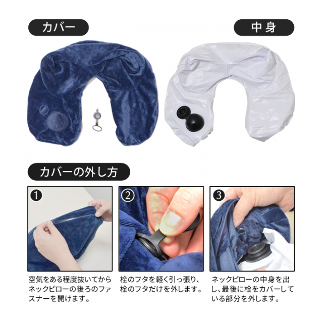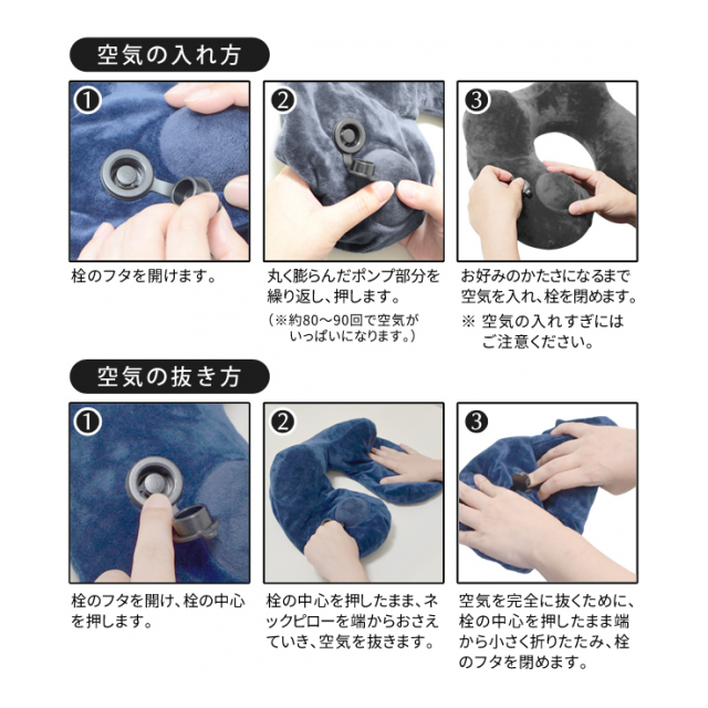 | ※ 必ず、膨らみ具合を確認しながら空気を注入してください。空気の入れすぎは破裂・破損の原因となります。 ※ 時間の経過と共に空気が多少抜けていくことがありますが、故障ではありません。 ※ 摩擦や水濡れなどで色落ち・色移りする場合があります。ご注意ください。 ※ カバーのお手入れは、手洗いをした後、直射日光に当てず日陰の風通しの良い所で乾燥させてください。 ・ 本品は頭部用クッションとして作られた物であり、安全用具ではありません。 ・ 水上で浮き具や救命具としては使用しないでください。 ・ ガラス片、金属片、木片などとがったものと接触させないでください。 ・ 火気に近づけないでください。 ・ 車を運転しながら使用しないでください。 ・ 掲載画像はイメージであり、実際の製品とは多少異なる場合があります。 ・ 製品の仕様は品質の向上・改善のため、予告なく変更となる場合があります。 |
