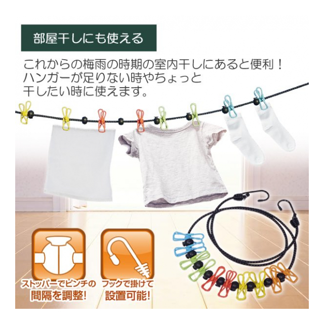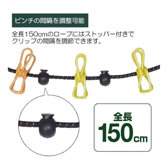 全長150cmのロープにはストッパー付きでクリップの間隔を調節できます。