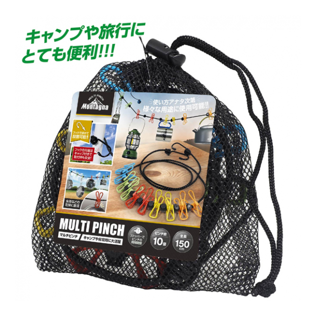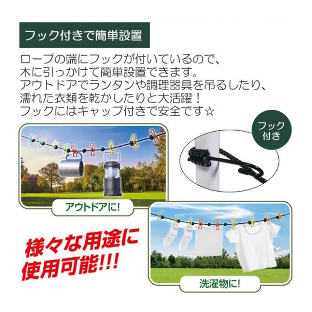 | 材質 ピンチ・フック:PVC、鉄 ロープ:ゴム、PP 収納袋:ポリエステル、ナイロン |
