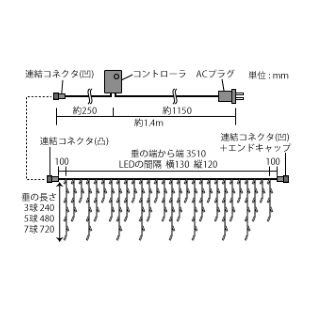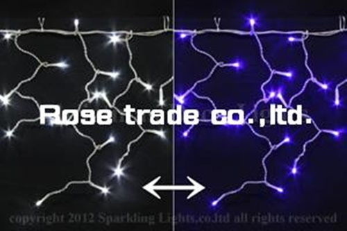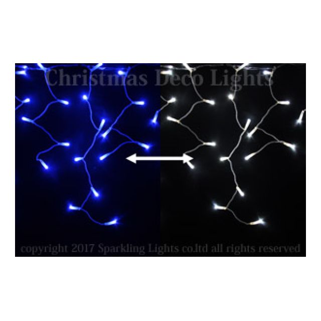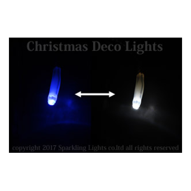| ブルーとホワイトに色が変化 1球のLEDにブルーとホワイトのチップを内蔵しています。 選べる点灯パターン 付属のコントローラ付専用パワーコードで、 8 種類の点滅方法を押しボタンで選択可能です。 1. 2色カラーフェード(15.75秒周期) 2. 常時点灯 ブルー 3. 常時点灯 ホワイト 4. 常時点灯 2色ミックス 5〜8. 2色交互点滅(速度4段階) ※メモリ機能を搭載しています。 電源を再投入すると前回選択したパターンで点灯します。 使いやすいアイシクル(ツララ)タイプ 軒下やバルコニー、フェンスなどを簡単に豪華に飾ることができます。 2重EVAチューブ採用で耐久性がさらに向上! 保護等級IP67を取得済(灯体部分) 「プロフェッショナルV4」(特許第5356861号) 電線とLEDの結合部分(LEDヘッド)を 劣化に強いEVAのチューブで2重に覆い、 従来製品よりさらに耐久性・耐候性が向上した 「プロフェッショナルV4」シリーズのイルミネーションです。 灯体部分の保護等級はIP67を取得しています。 ※コントローラ部分はIP44 静電気対策を実装 ツェナーダイオードを使用し、従来LED故障の原因となっていた LEDの破損にも対策を施しています。 丈夫なコードで物理的破損に強い LED間の電線に、イルミネーションとしては 太めのコードを使用しているため、 断線等の物理的な破損にも強い製品です。 連結部分は金属コネクタ採用 扱いやすく変形の少ない金属製のコネクタを採用しているので、 連結や電源コードの取り外しが簡単です。 コネクタ部分も灯体と同等の防塵・防水性があります。 LEDは広角パッケージを採用 どこから見ても明るく見える広角パッケージのLEDを使用。 LEDなので低消費電力・低発熱。 消費電力はペッパー電球の約1/10です。 電球と比べてとても発熱が少ないので植栽に飾っても安心です。 100V仕様でアダプタ不要 ご家庭の100V電源(コンセント)が そのまま使えますのでACアダプタ等は不要です。 鮮やかで明るいブルーとホワイトのLED 明るく濃いブルー(青)とクールなホワイト(白)の組み合わせです。 |