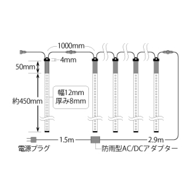 電飾ケース間のピッチが約1mあり、細めのコードを使用している為、取り回しも楽にできます。