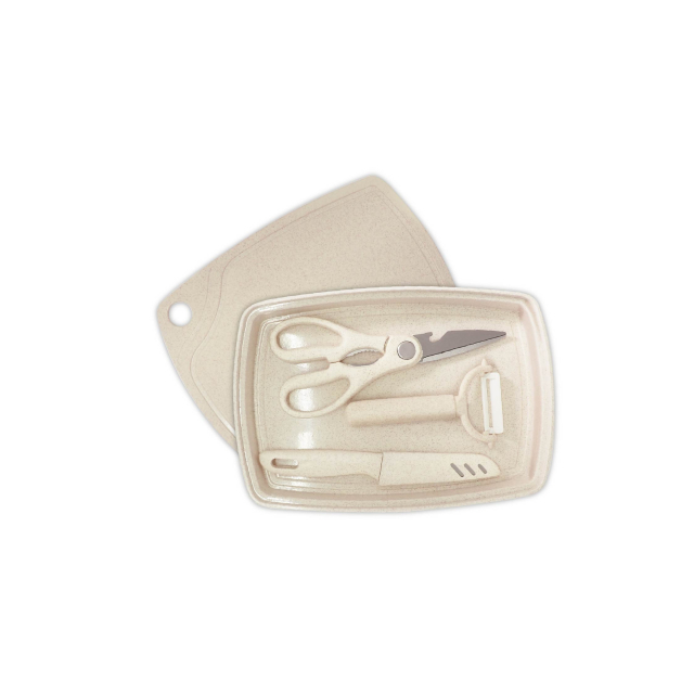 まな板と調理ツール(万能ハサミ・ピーラー・ナイフ)、