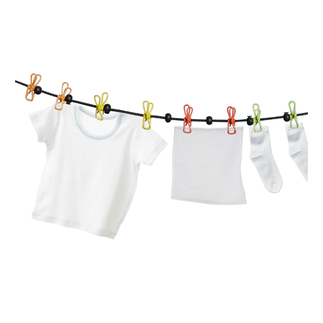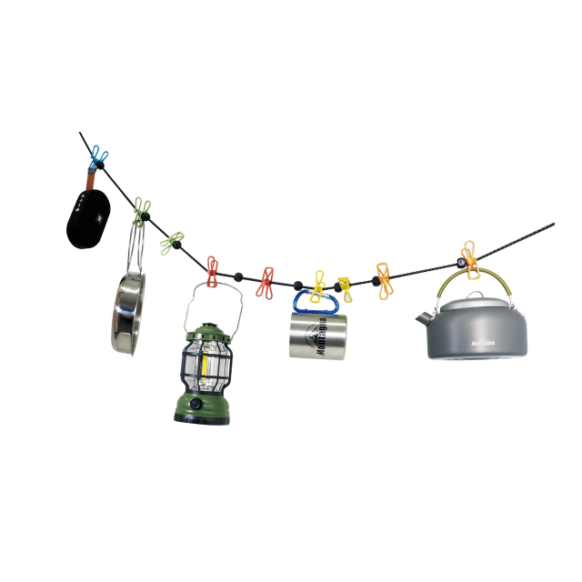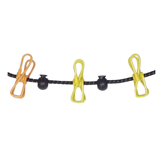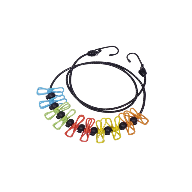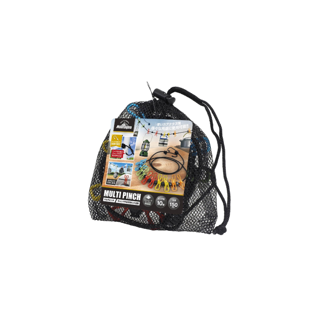 | サイズ 約W150×D5.7×H3.3cm(ロープ全長) 約W15.5×D6×H15.5cm(収納時) 重 量 約180g(本体) 主材質 PVC・鉄(ピンチ・フック) ゴム・PP(ロープ) ポリエステル・ナイロン(収納袋) |