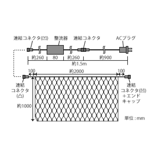 | コード色 ブラック(黒) 消費電力 10W 入力電圧 100V 入力電流 0.1A 高さ 1m 幅 2m 球数 180 連結 推奨1500球(最大1800球)まで |