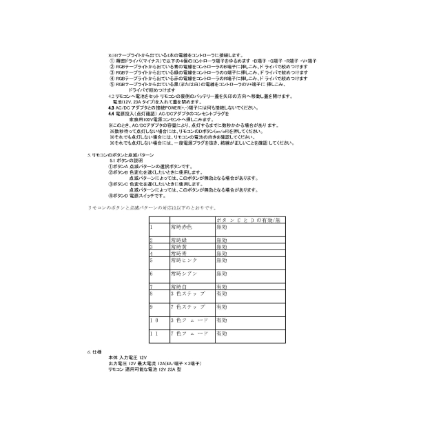 | 点灯パターン 3色/7色ステップ、3色/7色フェード(自動色変化)、 単色固定(白、R、G、B とその中間色の 7色) などのパターンが選択可能です。 ステップやフェードのスピード調節も可能です。 明るさ調節はできません。 操作は付属のリモコンで行います。 電流容量 最大4A/ch(合計最大12A) 電流容量は1チャンネルあたり最大4A、 3チャンネル合計で最大12Aになります。 電力容量は 12Vの場合 最大48W/ch(合計最大144W)、 24Vの場合 最大96W/ch(合計最大288W)です。 ※安定した動作の為に、 接続する灯体の消費電力の合計は上記電力容量の 7-8割以内を目安としてください。 SMD5050型(60球/mタイプ)の RGBテープライト 5m巻き を接続する場合、 2巻(10m)以内でお使いください。 ※各製品の消費電力値は製品の販売単位 そのままで点灯させた場合を基準にした値です。 短くカットして使用する場合、 単位長さ(モジュール数)あたりの消費電力は上昇します。 カットして使用する場合はより余裕を見て消費電力を計算してください。 ※直列連結可能な長さ(モジュール数)は 灯体の種類ごとに上限があります。 直列連結可能な長さを超える場合は並列に接続してください。 ※別売の信号増幅器(アンプ)を使用することで、 1台のコントローラで制御する灯体をさらに増設することが可能です。 ご使用方法・ご注意点 ご使用方法は マニュアルをご参照ください。 ※DC電源入力端子(POWER +, −)は、 電線ネジ止め式の端子台 または DCジャック(外径5.5φ、内径2.1φ)です。 R, G, B, V+ の出力端子は、電線ネジ止め式の端子台です。 ※DC電源(AC/DCアダプタ)は別売です。 接続する灯体の電圧仕様・消費電力に応じて、 適切な電圧・容量の DC電源をご用意ください。 ※本製品にコード類は付属しておりません。 コード類が付属しない DC電源(スイッチング電源)と接続する場合、 別途 2芯電線 または DCプラグケーブル が必要になります。 |