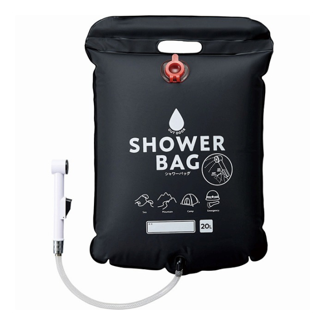 持ち運べるポータブルシャワー災害時の水浴び用として、キャンプでも使用できます。シャワーヘッドはストッパー付き。太陽光を吸収しやすい黒色なので、放置して水を温めやすい。フック付きロープでいろいろなところに引っ掛けて使用できます。