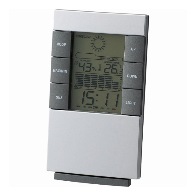 最新12時間の気温の移り変わりグラフまで付いた見やすい多機能時計です。・時計・アラーム・スヌーズ・温度計・湿度計・天気予報・12時間気温変化グラフ・カレンダー・バックライト