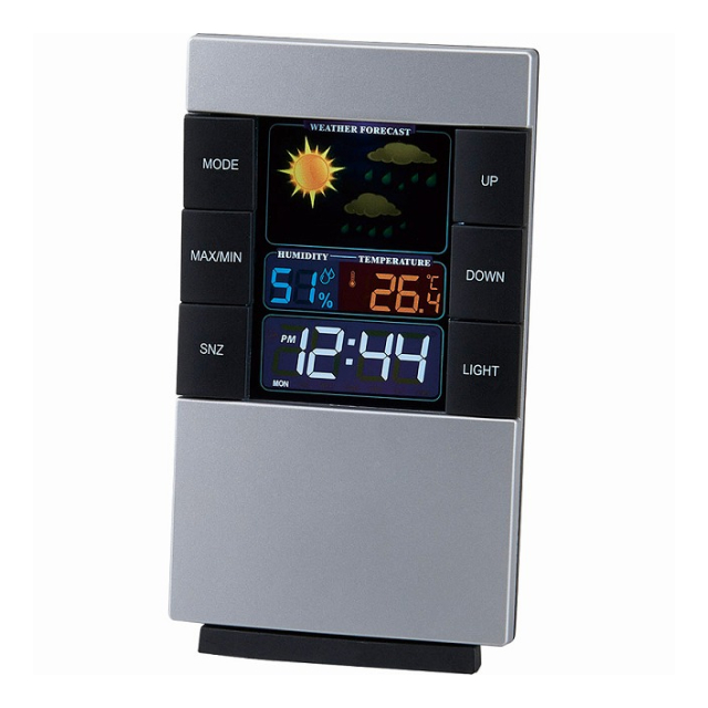 天気予報、温度、湿度がカラー表示される見やすい多機能時計です。音・振動センサー付でバックライトが自動点灯。・時計・アラーム・スヌーズ・温度計・湿度計・天気予報・カレンダー・バックライト・音・振動センサー
