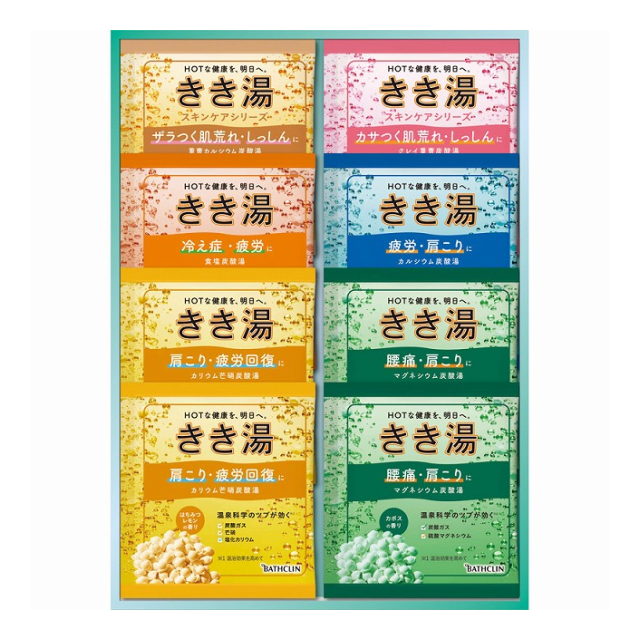 | 入浴剤:30g×8(マグネシウム炭酸湯・カリウム芒硝炭酸湯×各2、クレイ重曹炭酸湯・食塩炭酸湯・重曹カルシウム炭酸湯・カルシウム炭酸湯×各1) |