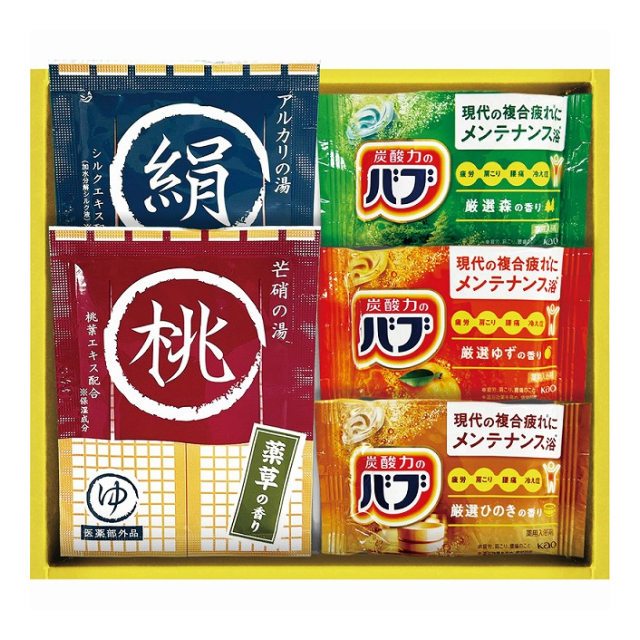| バブ:40g×3(森・ゆず・ひのき×各1)、薬用入浴剤:20g×2(梅・薬草×各1) |