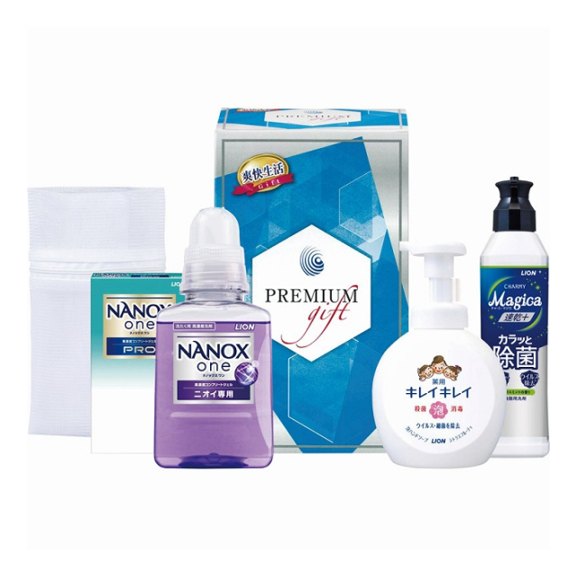 | ライオンキレイキレイ薬用泡ハンドソープ:250mL・ライオンナノックスワン ニオイ専用:380g・ライオンナノックスワンプロ2P・ライオンマジカ速乾プラスカラッと除菌:220mL・洗濯ネット×各1 |