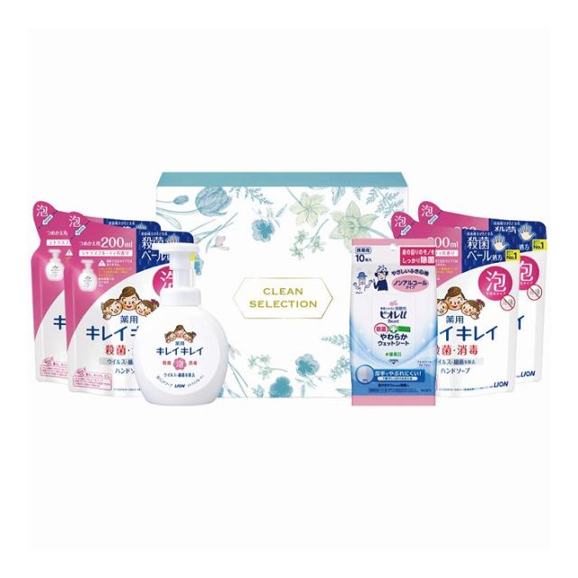| ライオンキレイキレイ薬用泡ハンドソープ:250mL×1、詰替:200mL×4、花王ビオレu除菌やわらかウエットシートノンアルコール10枚×1 |
