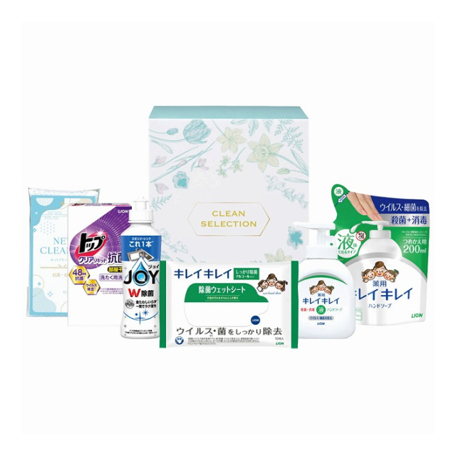 | ライオンキレイキレイ薬用液体ハンドソープ:250mL・詰替:200mL・ライオンキレイキレイ除菌ウェットシート(アルコールタイプ)10枚・P&G除菌ジョイコンパクト:170mL・ライオントップクリアリキッド抗菌2P・ネットクリーナー×各1 |