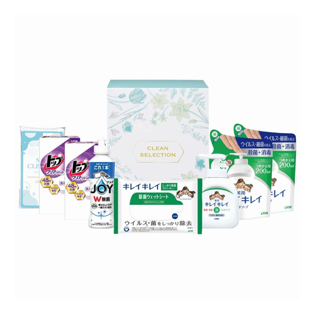 | ライオンキレイキレイ薬用液体ハンドソープ:250mL×1、詰替:200mL×2、ライオンキレイキレイ除菌ウェットシート(アルコールタイプ)10枚・P&G除菌ジョイコンパクト:170mL×各1、ライオントップクリアリキッド抗菌2P×2、ネットクリーナー×1 |