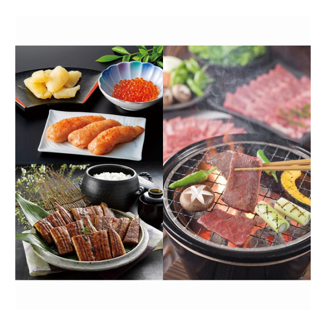| 〔A〕北海道産いくら醤油漬け40g・やまや明太子(切子込み)150g・味付け数の子60g×各3、〔B〕愛知県産うなぎ190g×2、〔C〕三大和牛焼肉食べ比べ420g×2 |