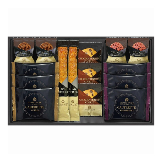 | ロングスティックパイ×2、ゴーフレット×6(バニラ・ストロベリー×各3)、チョコクランチ×4(ミルク・ストロベリー×各2)、チョコチップクッキー×3 |