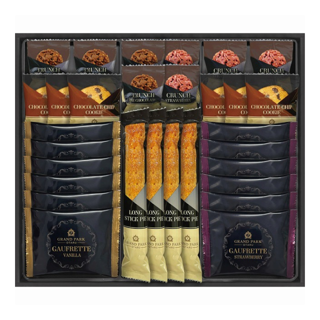 | ロングスティックパイ×4、ゴーフレット×12(バニラ・ストロベリー×各6)、チョコクランチ×8(ミルク・ストロベリー×各4)、チョコチップクッキー×6 |