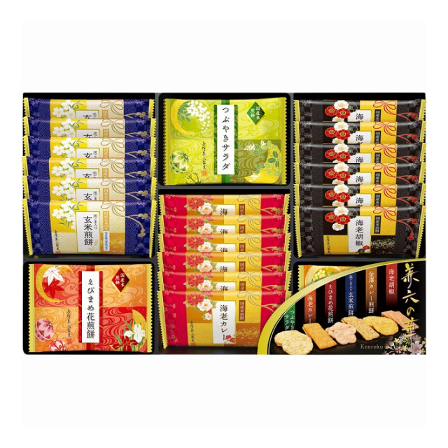 | 海老カレー煎餅×6、えびまめ花煎餅・つぶ焼きサラダ煎餅×各3、黒ごま入り玄米煎餅・海老胡椒煎餅×各6、金澤カレー煎餅×3 |