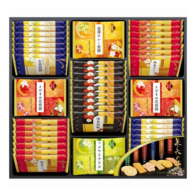| 海老カレー煎餅×14、えびまめ花煎餅×10、つぶ焼きサラダ煎餅×5、黒ごま入り玄米煎餅×14、海老胡椒煎餅×9、金澤カレー煎餅×5 |